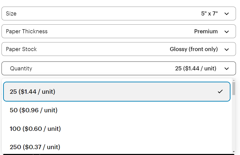 For RacPress I’m doing 5×7″ postcards, and for my own work I have also done 4×6″ as they are a little easier to carry in my bag for daily life giveaways. Ordering them in a larger quantity can bring the cost down (screenshot is from Vistaprint) but sometimes you want a smaller amount to do market testing with, and you can have those run up at your local printshop on letter-sized cardstock and cut them yourself (don’t use scissors!).