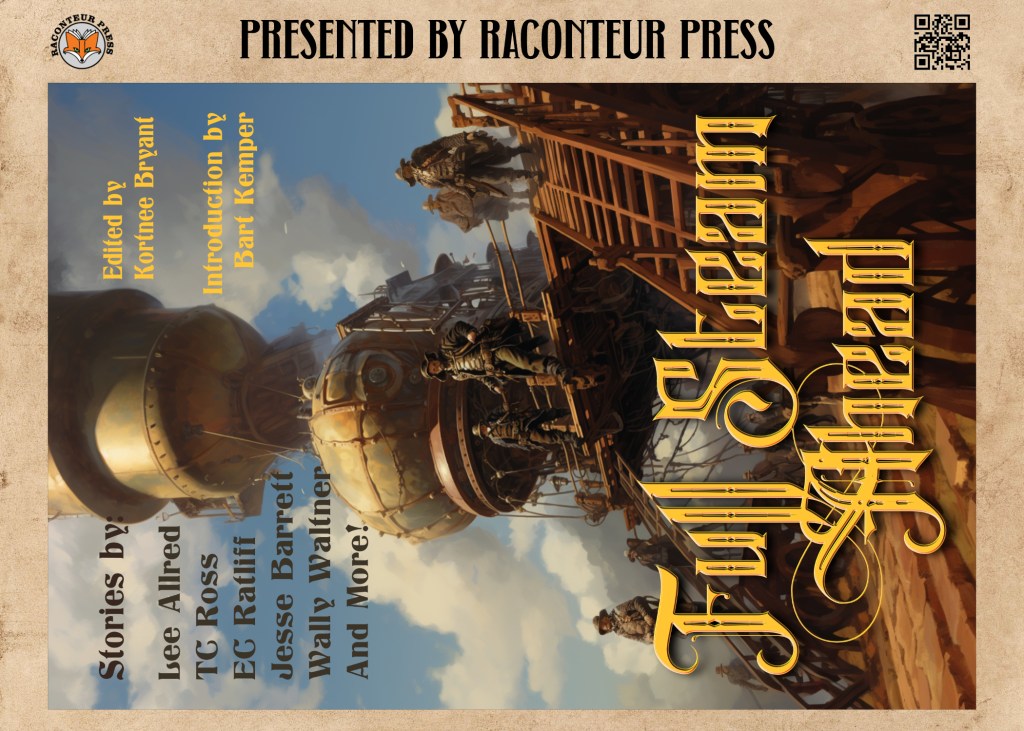 Rac Press has specific branding beats I use in all the promo materials, the worn parchment background, the name of the press, the logo, and the qr code. With the above postcard, which we will have printed in job lots through Office Depot, I included a blurb reminding the recipient what the books are about. The covers speak loudly for themselves, sure, but I had room to elaborate, so why not? Also, the three-book mini-series within the larger anthology series is about right for a postcard. I wouldn’t put more than this on a card any longer. In fact, for a singleton like Full Steam Ahead, I did a full card to highlight the cover.
