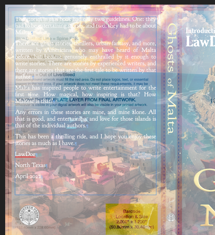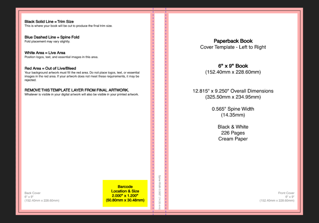Your final product will be a single seamless file, print-ready for a perfectbound paperback. The same thing can be done for a hardcover with a template from Amazon, which will only work for Amazon, as Ingram Spark’s version is quite different (and better in my opinion). Just follow the template! It makes it so much easier and faster.