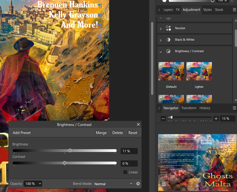 My final look at this is to consider the printing process. The sublimation of dyes to the paper often leaves the artwork darker than the appearance on a lit monitor. For this reason, I usually adjust the artwork lighter before sending it to print. Generally speaking, no more than 10-15% brighter is necessary unless your cover is very dark, and in that case you may need to reconsider your art choices as a very dark cover isn’t best at thumbnail.