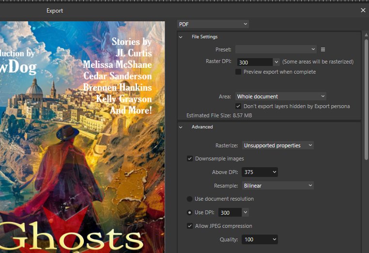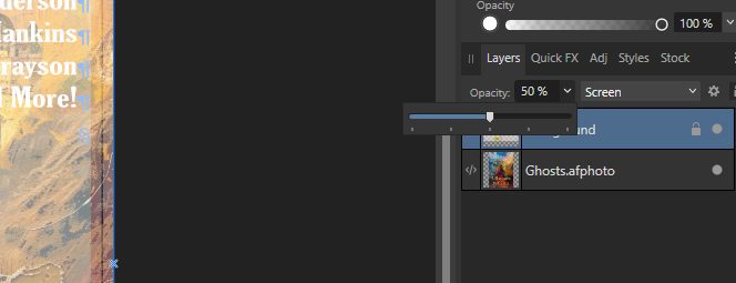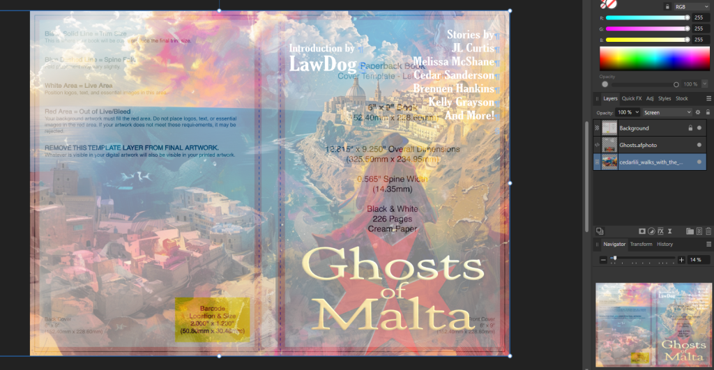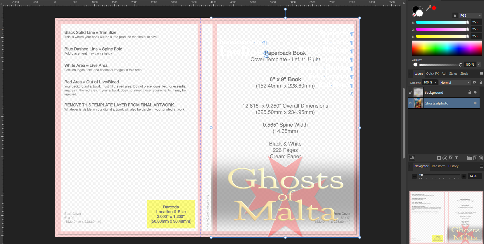 I have lowered the transparency of the template so I can easily see through it for layout of text, but can still readily see my cut lines and out of bounds areas. In Affinity Photo, if you doubleclick the embedded file you placed (Ghosts.afphoto in the layer list above) it will open in a new tab and allow changes to be made non-destructively to the original file.