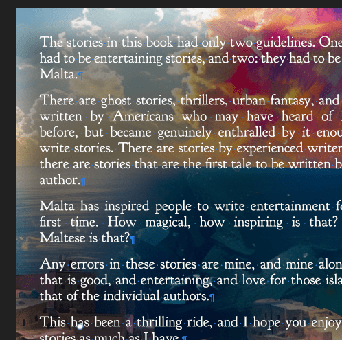 Generally speaking I opt to use a font here which is the plainer of the ones on the cover, or complementary to them. It should be readable, and I prefer to fully justify the paragraphs on the back cover for clean edges. You’ll note it’s hard to read – the transparent template isn’t helpful for that! – so I will make sure it’s legible by toggling off the template and choosing a better font color if necessary, or using a fill box below the text to allow it to be best readable on the art.