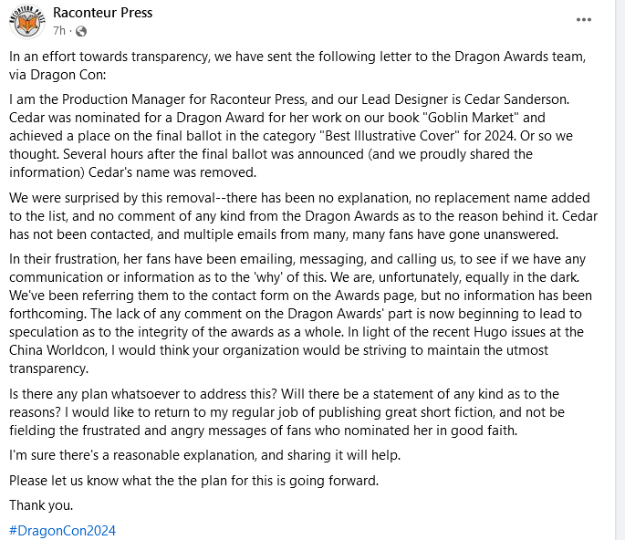 But I know a lot of people are seething over this, and before we assume the worst about the Dragon awards, they should be given a full opportunity to explain themselves on the disappearance of Cedar from the ballot. Every possible chance, in fact.