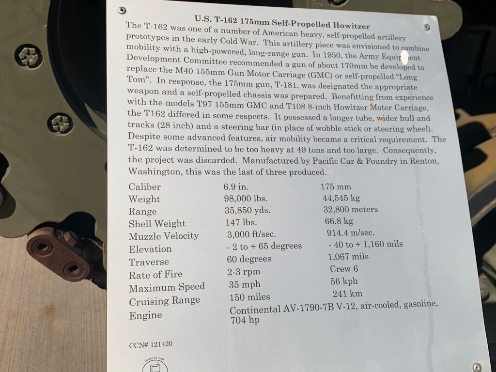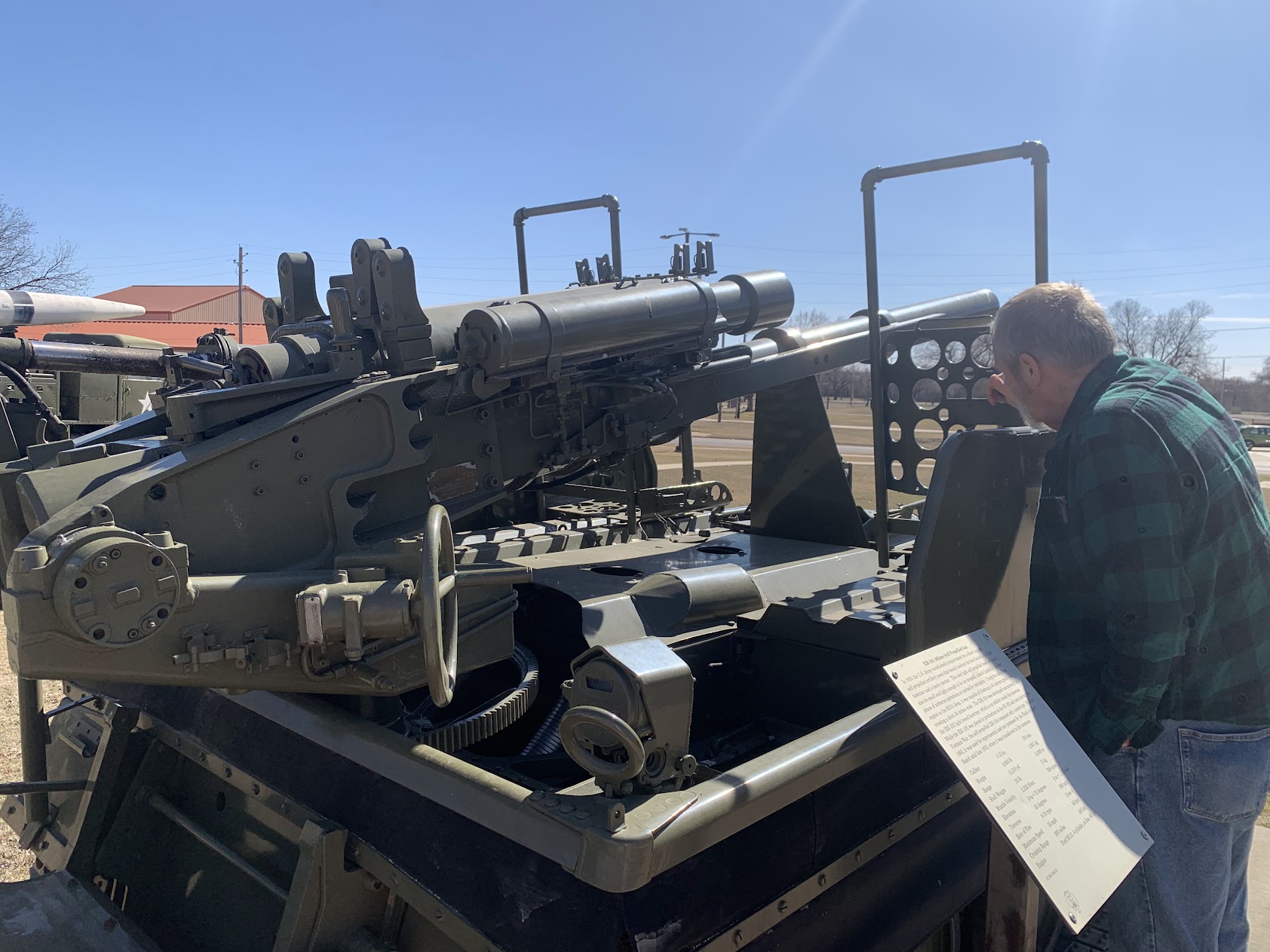 I asked the First Reader ‘where do they ride?’ as this vehicle had wheels, but no obvious way for the men who manned the gun to shelter. Turns out, those pipe and pierced metal racks are seats. He’s showing me where they could sit, although it looks darned uncomfortable, or stand holding the pipe (looks like plumbing!) and ride along that way. Seems like a good way to fall off, to me, but then again… when you must.