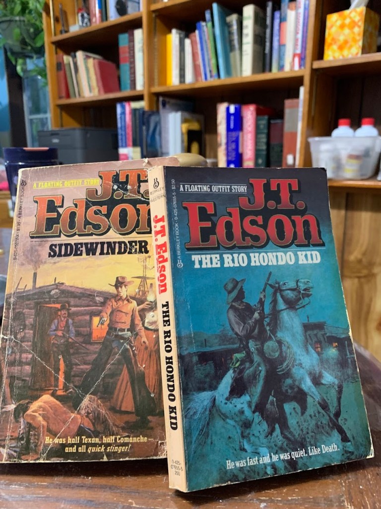 The other day I took him along for the first time while visiting the Friends of the Library Warehouse. Hardbacks are a dollar, paperbacks (and their definition of paperback is loose) are fifty cents. It is, needless to tell you all, a dangerous place. Fantastic for acquiring reference books, cheap, like the Miss Manner’s Guide to Excruciatingly Correct Behavior, and Emily Post’s Etiquette which I picked up on a recent visit. When my husband and I walked in, it was a week or so after they had added more shelving and moved things around, so the Western books were no longer where they had been. This was, of course, what my husband wanted to look at! We were shown where they had been moved, and faced with many linear feet of books, he happily settled into pulling books off the shelf, showing them to me, and telling me where he’d been when he first read that author. Mostly, field exercises in the army, or during some hours-long wait while the military shuffled their men from place to place. He didn’t necessarily remember the books, but the author’s style stuck with him. He eventually picked up three JT Edson novels, telling me gleefully how bad they are, and I found a history of the Korean War and another book on Rasputin (and perhaps a couple of other books), before we paid up and headed for coffee and breakfast.