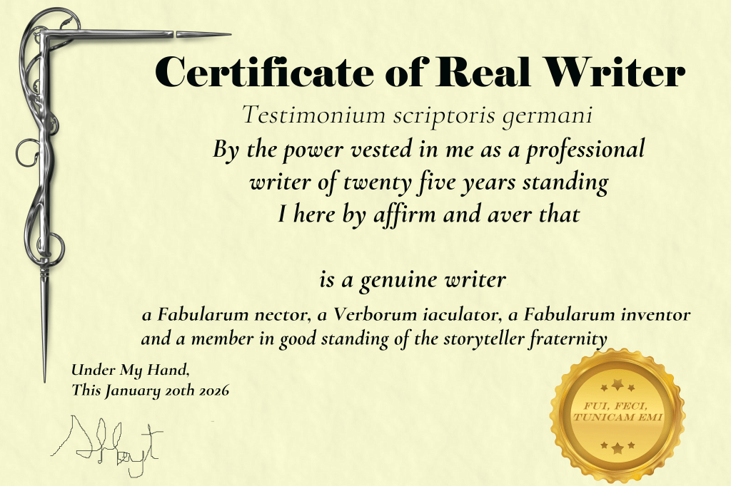 So you can get off that circular track and start up the mountain (Come on up, the granite is fine) I am out of the goodness of my heart providing you with a certificate, suitable for printing. All you need to do is fill in your name. I signed it and everything. And look, I was “professionally published” (dear Lord) … 29 years ago, and sold my first novel 25 years ago. So I know whence I’m speaking.