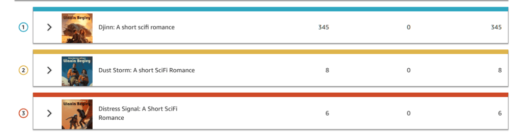 This really only works when you do have a backlist. Also, freebies like this are… not always effective at getting new readers. I don’t actually recommend putting a book to free, because there are people who will grab all the free books they can lay hands on and then never get around to reading them. We value what we’ve paid for. Setting a lower price rather than free means the reader will pick up the book they are interested in, not just looking at the price tag. In the above image, you see some of that, where hundreds of downloads translates out to a tiny percentage of read-throughs. I’ll report back next week if the numbers change after the sale is done. The first day of the sale was the day I got the most downloads by far, which is fairly normal for a sale in my experience.