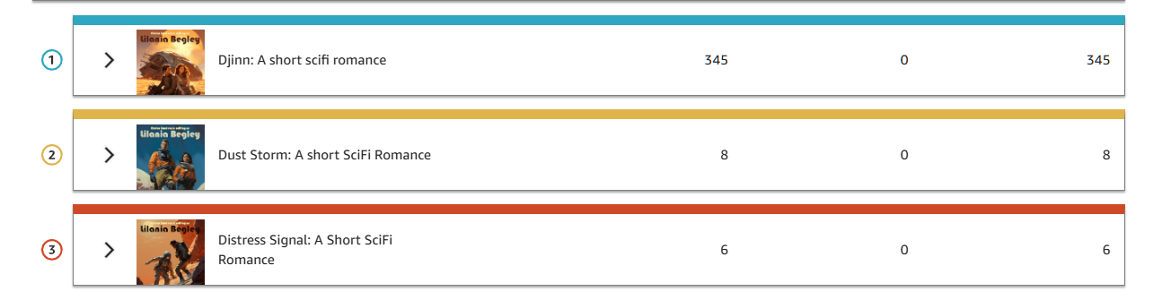 Above is the results of this little experiment, three days in. I’ve given away 345 copies of Djinn, and about two percent of those readers went ahead and bought the whole series. This is why I put Djinn in the sale, and set it to free. I was curious to see, with this little experimental series of short stories, what would happen. It cost me nothing, and perhaps it’s gained me a half-dozen new readers. We’re not talking a lot of money, here, those are each priced at $0.99 and I get about $0.34 from each sale. However, if those readers then go on to read through my backlist, I’ve got a lot of books for them to enjoy.